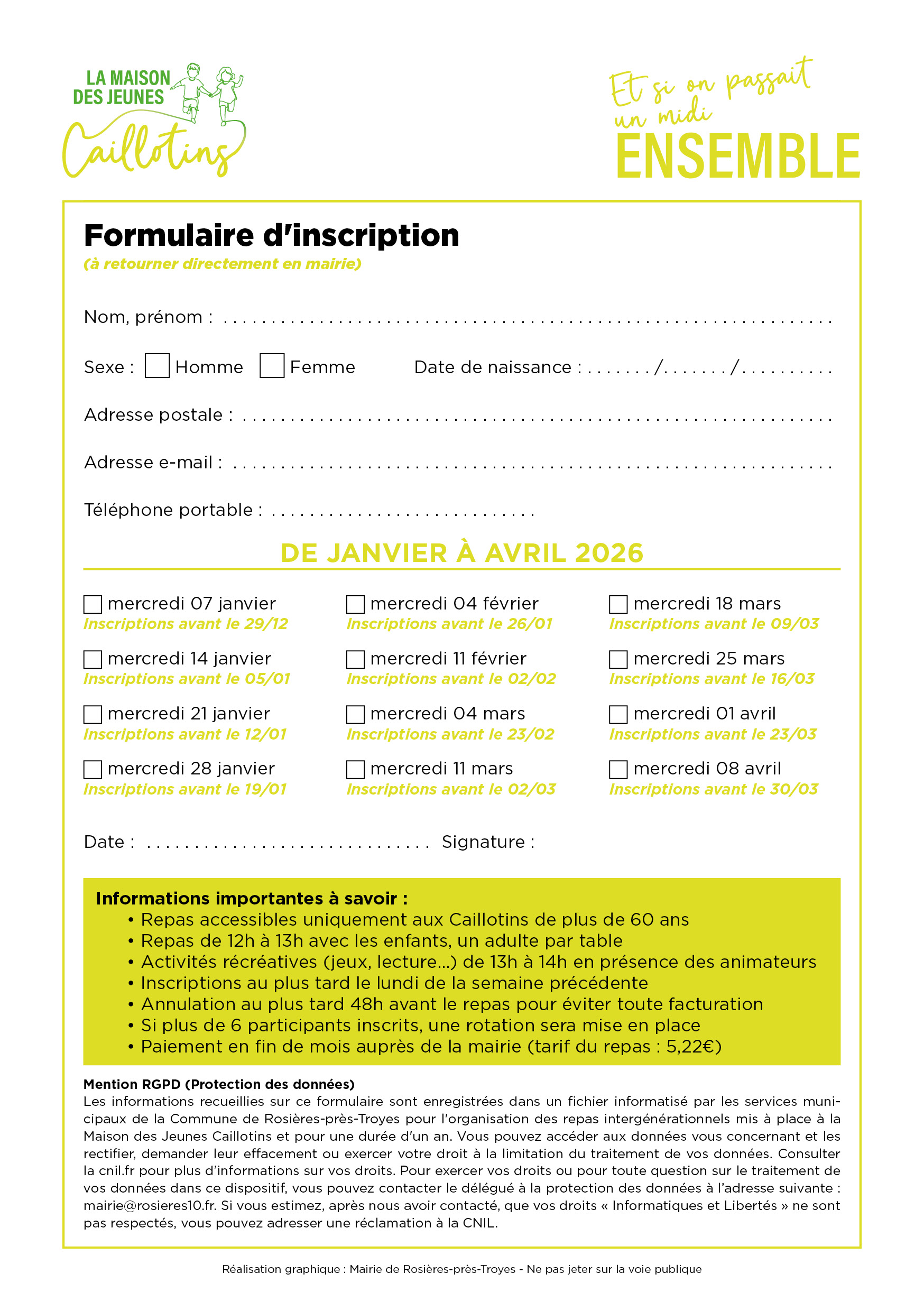 • Participation : 6 adultes (Caillotins de plus de 60 ans obligatoirement) maximum par repas (rotation possible si nombre important d’inscrits)