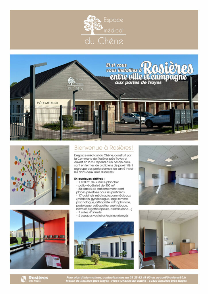 L’Espace médical du Chêne, construit par la Commune de Rosières-près-Troyes et ouvert en 2020, répond à un besoin croissant en termes de praticiens de proximité. Il regroupe des professionnels de santé installés dans deux ailes distinctes.